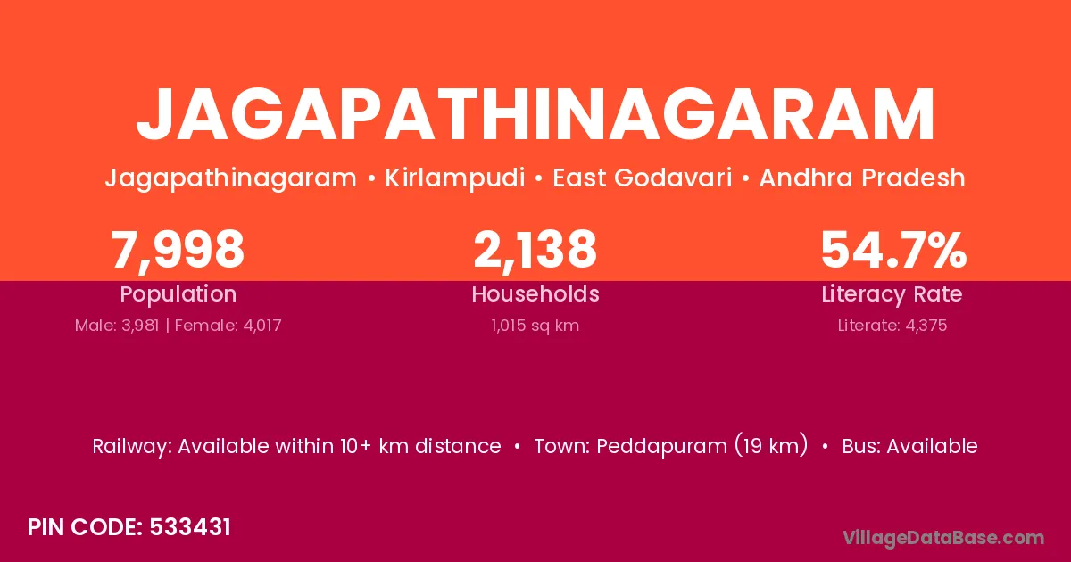 Jagapathinagaram village has a total population of 7,998 people, of which 3,981 are males and 4,017 are females.