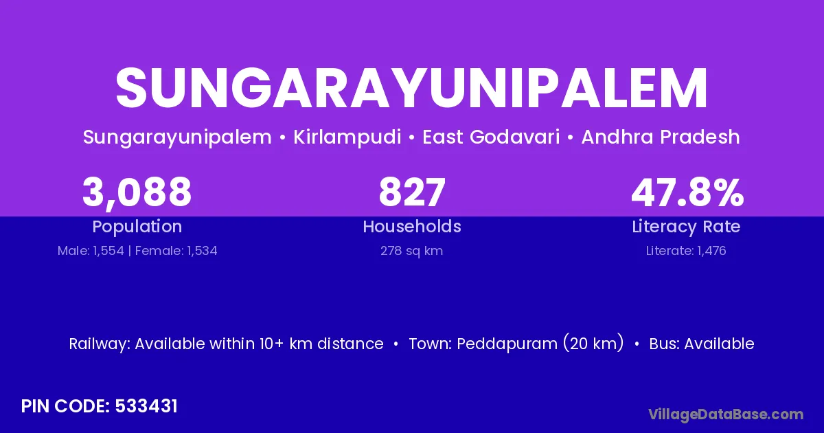 Peddapuram (20 km) is the nearest town to Sungarayunipalem village for major economic activities and is located approximately 20 km away.