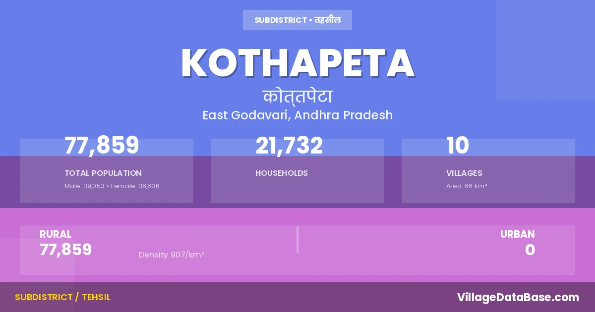 According to the 2011 census The total area of Kothapeta Mandal is 86 km², with a population of 77859 people. The population density is 907 inhabitants per square kilometre, and there are approximately 21732 houses in the sub district.