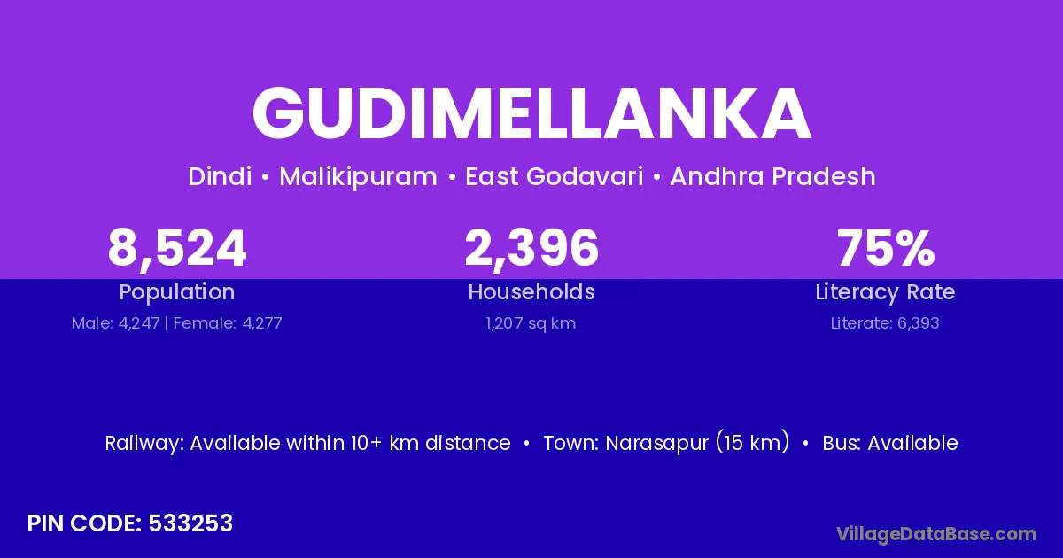 Narasapur (15 km) is the nearest town to Gudimellanka village for major economic activities and is located approximately 15 km away.