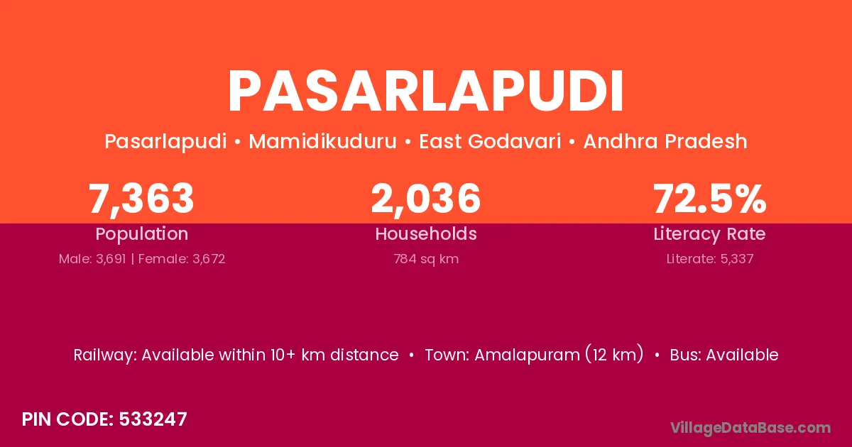 Amalapuram (12 km) is the nearest town to Pasarlapudi village for major economic activities and is located approximately 12 km away.