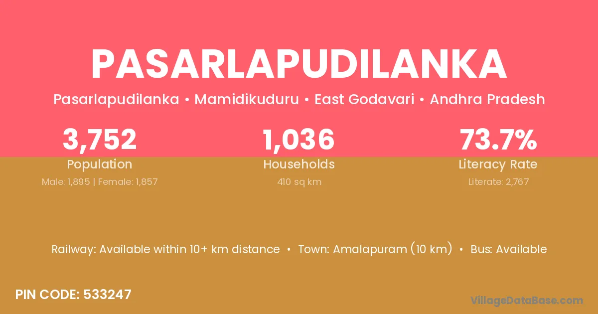 Pasarlapudilanka village has a total population of 3,752 people, of which 1,895 are males and 1,857 are females.