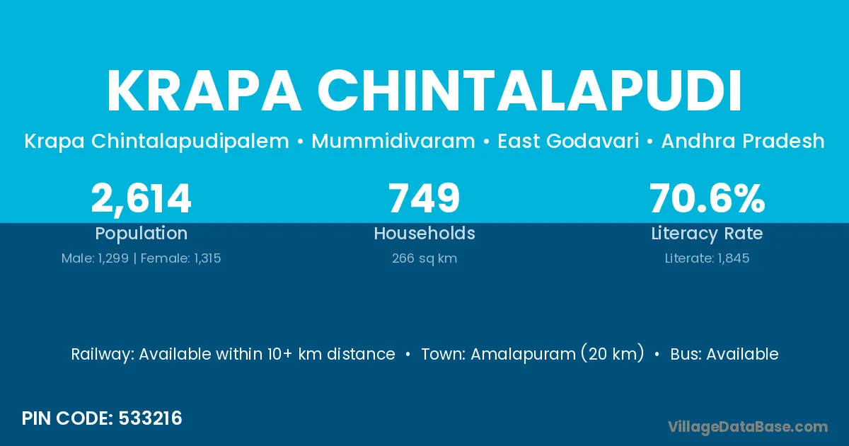 Amalapuram (20 km) is the nearest town to Krapa Chintalapudi village for major economic activities and is located approximately 20 km away.