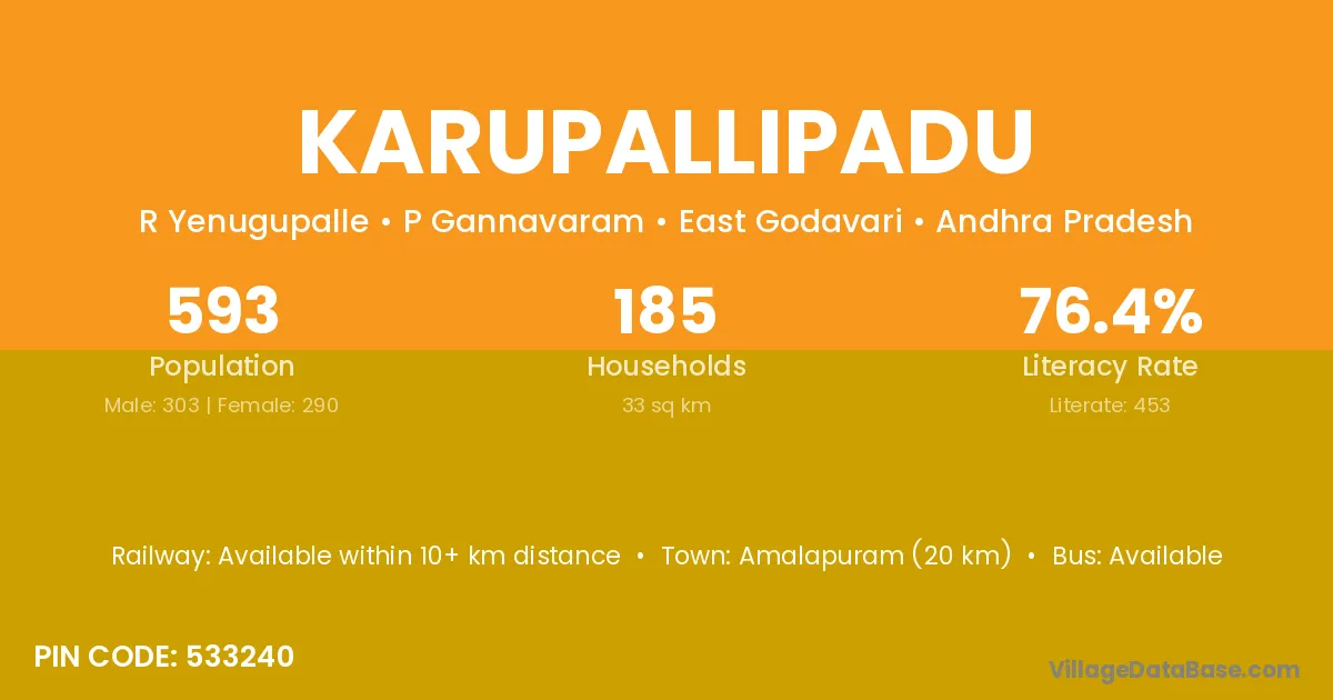 Amalapuram (20 km) is the nearest town to Karupallipadu village for major economic activities and is located approximately 20 km away.