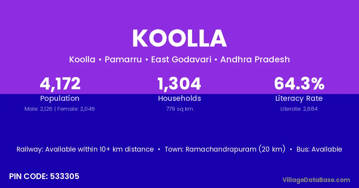 Ramachandrapuram (20 km) is the nearest town to Koolla village for major economic activities and is located approximately 20 km away.