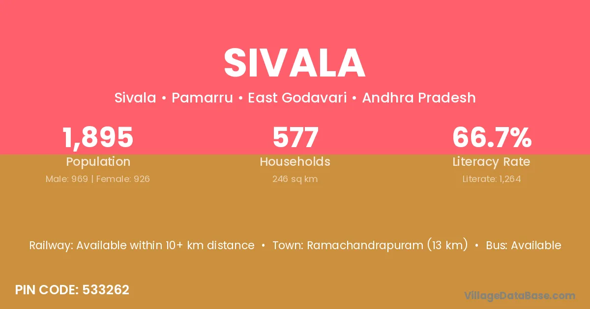 Ramachandrapuram (13 km) is the nearest town to Sivala village for major economic activities and is located approximately 13 km away.