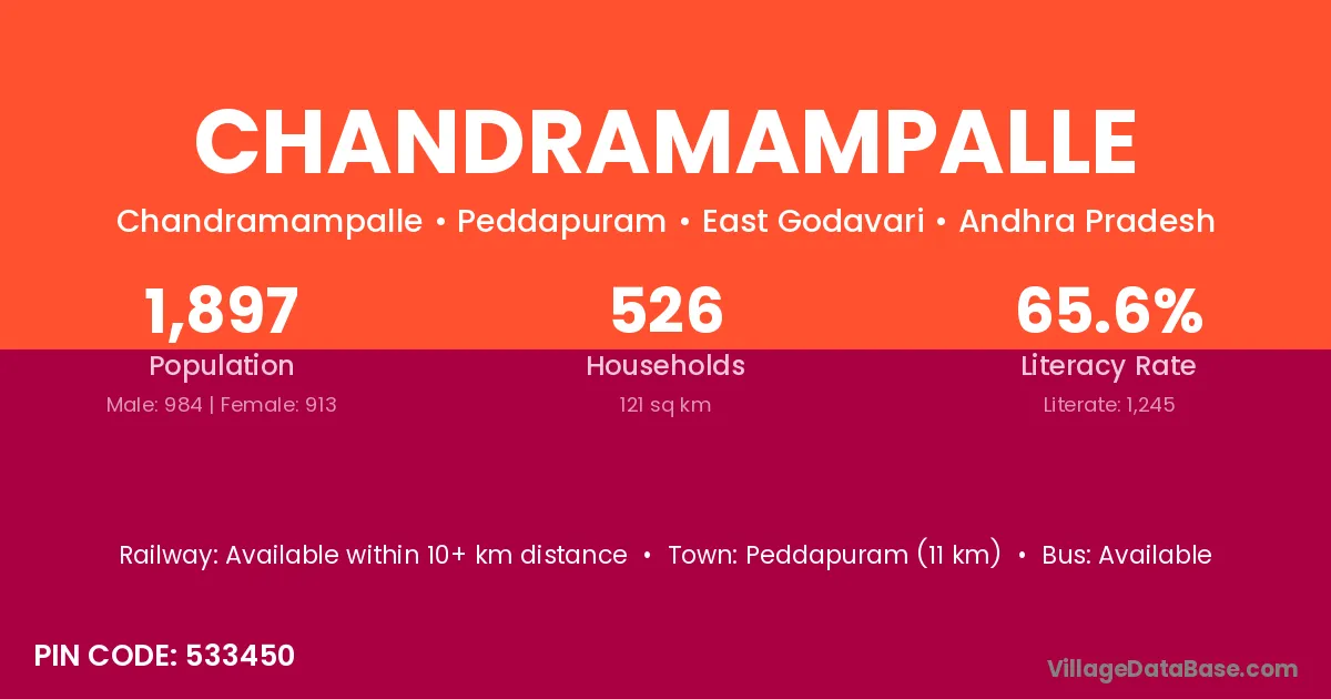 Peddapuram (11 km) is the nearest town to Chandramampalle village for major economic activities and is located approximately 11 km away.