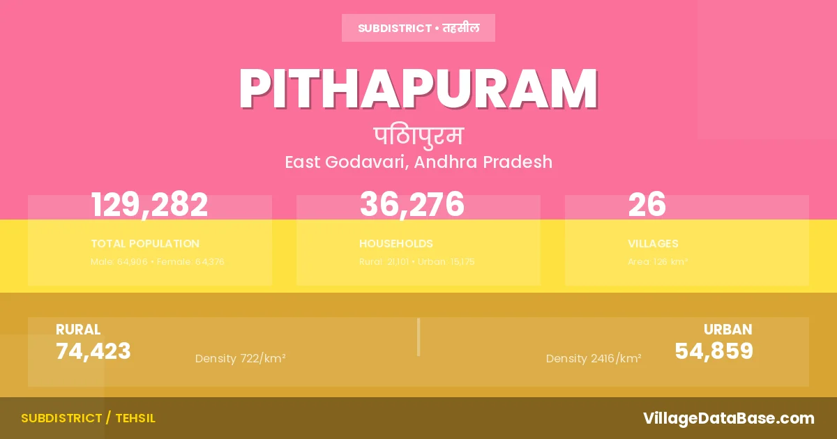 According to the 2011 census The total area of Pithapuram Mandal is 126 km², with a population of 129282 people. The population density is 1,027 inhabitants per square kilometre, and there are approximately 36276 houses in the sub district.