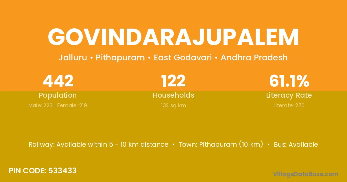 Govindarajupalem village has a total population of 442 people, of which 223 are males and 219 are females.