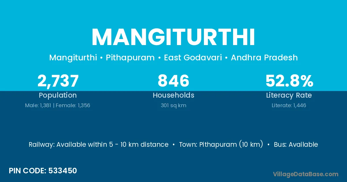 Pithapuram (10 km) is the nearest town to Mangiturthi village for major economic activities and is located approximately 10 km away.
