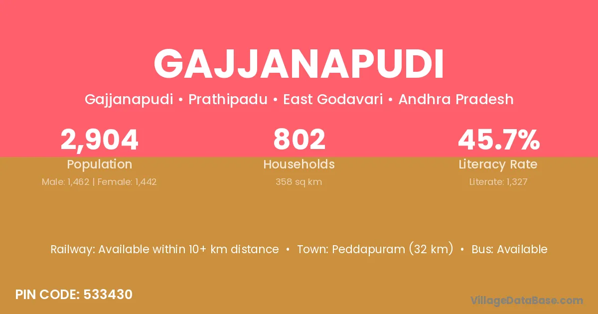 Peddapuram (32 km) is the nearest town to Gajjanapudi village for major economic activities and is located approximately 32 km away.