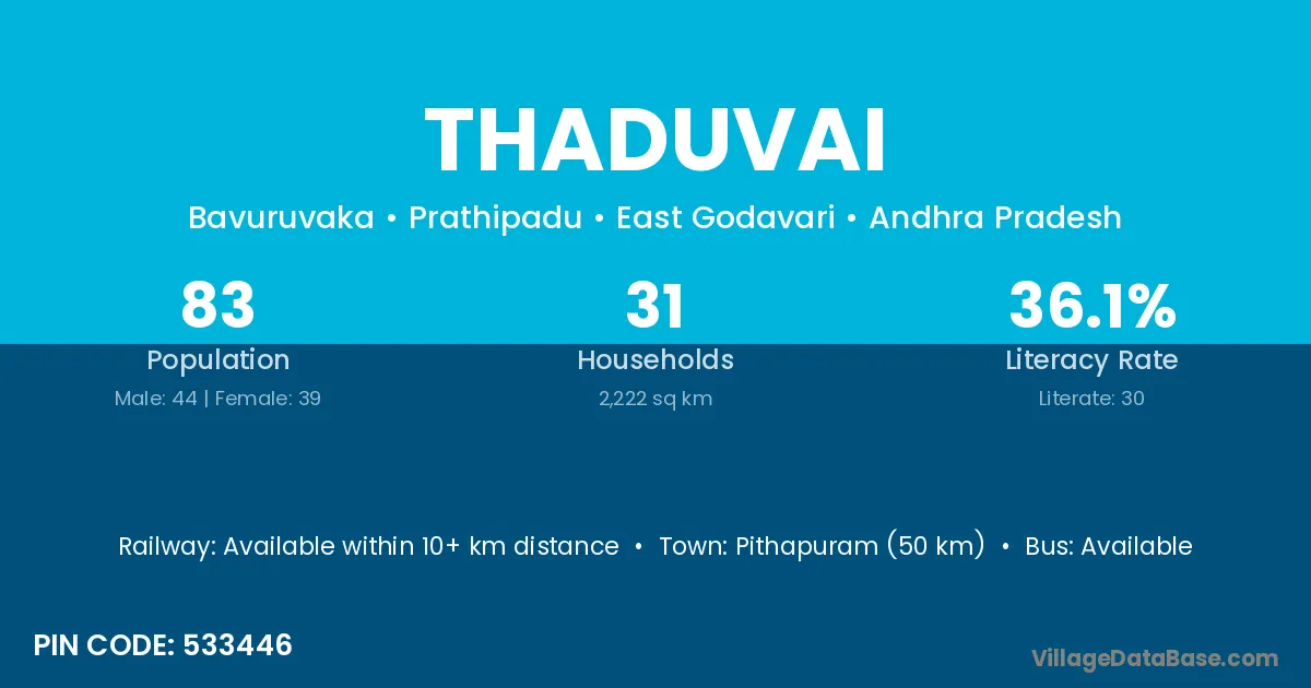 Pithapuram (50 km) is the nearest town to Thaduvai village for major economic activities and is located approximately 50 km away.