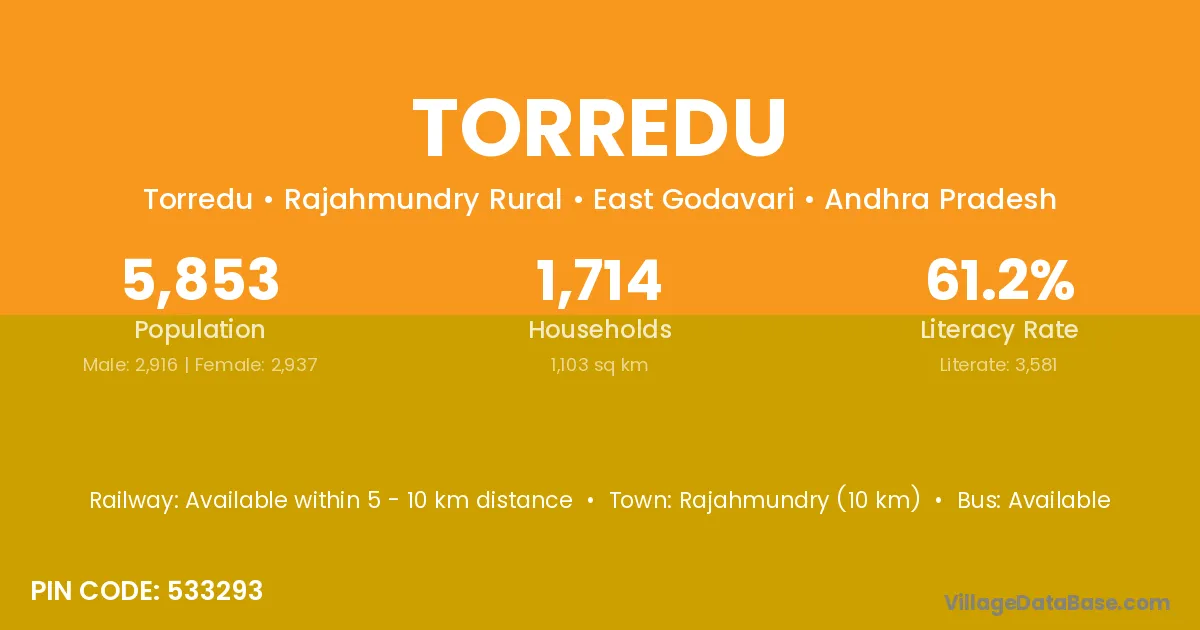 Rajahmundry (10 km) is the nearest town to Torredu village for major economic activities and is located approximately 10 km away.