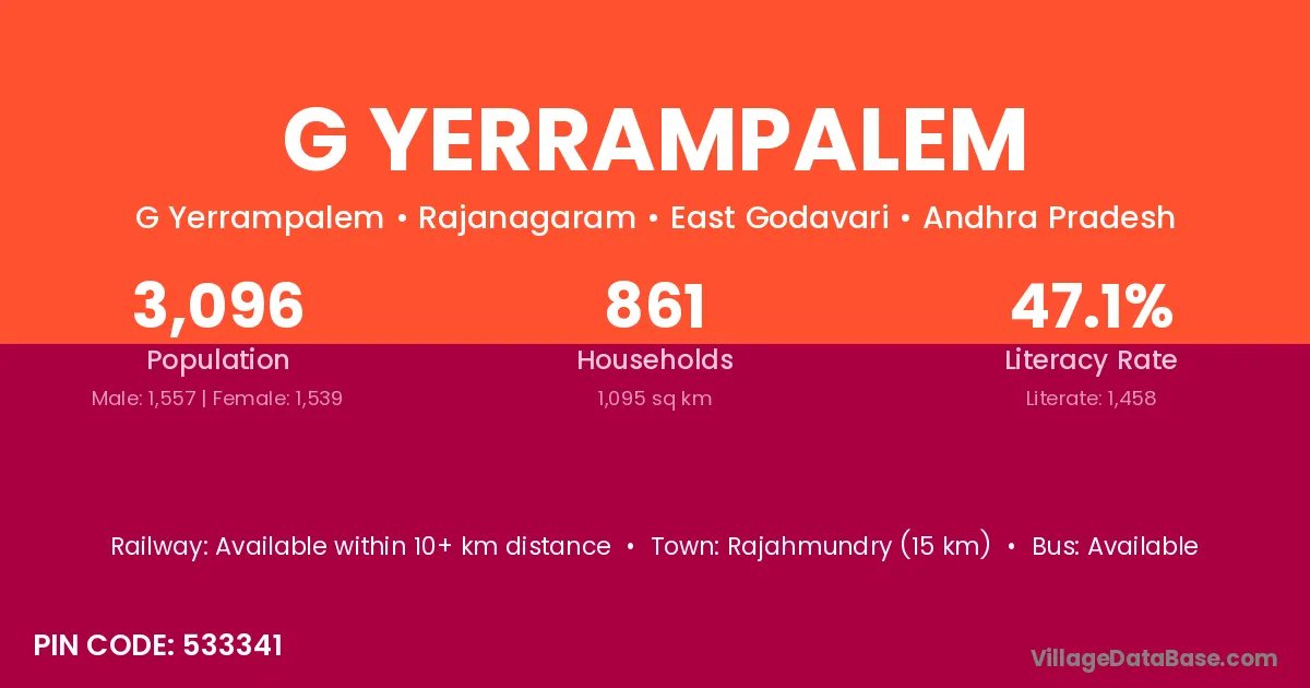 Rajahmundry (15 km) is the nearest town to G Yerrampalem village for major economic activities and is located approximately 15 km away.