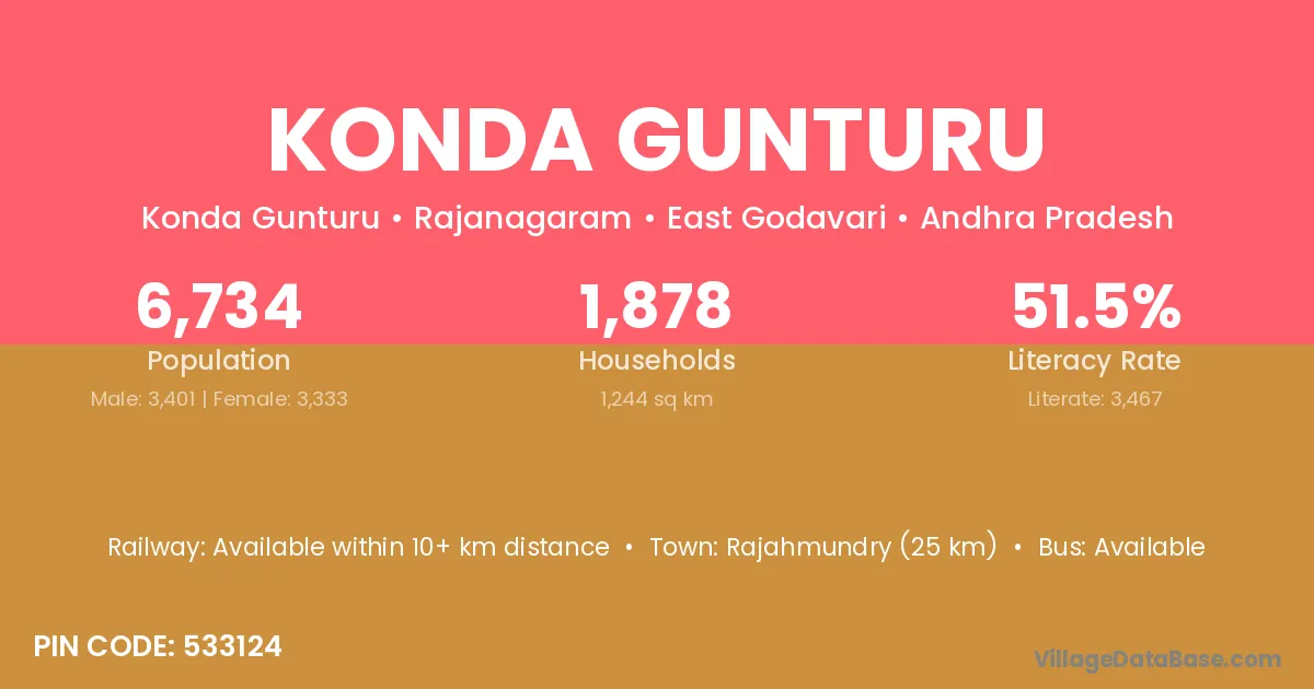 Rajahmundry (25 km) is the nearest town to Konda Gunturu village for major economic activities and is located approximately 25 km away.