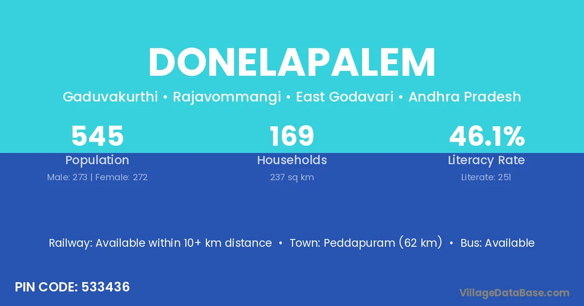 Peddapuram (62 km) is the nearest town to Donelapalem village for major economic activities and is located approximately 62 km away.