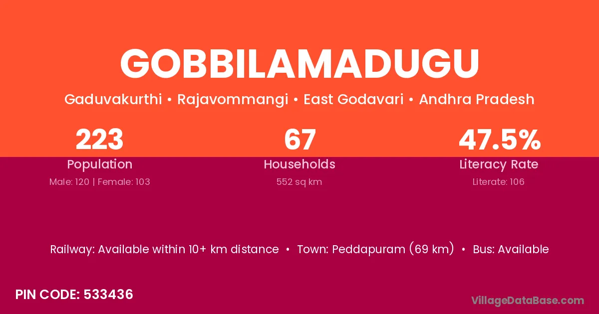 Gobbilamadugu village has a total population of 223 people, of which 120 are males and 103 are females.
