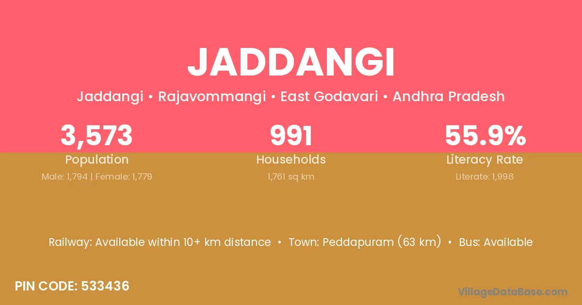 Peddapuram (63 km) is the nearest town to Jaddangi village for major economic activities and is located approximately 63 km away.