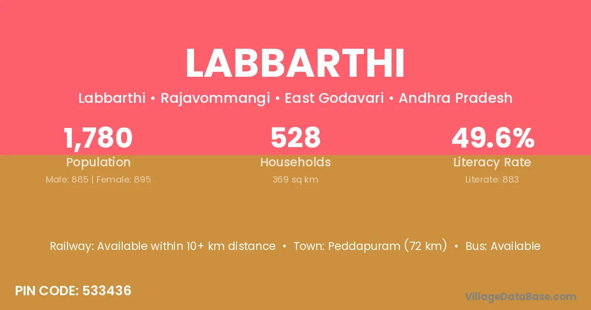 Peddapuram (72 km) is the nearest town to Labbarthi village for major economic activities and is located approximately 72 km away.