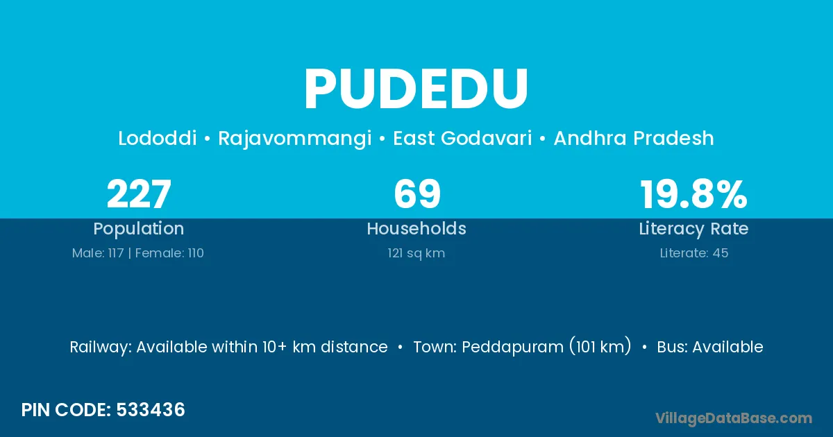 Pudedu village has a total population of 227 people, of which 117 are males and 110 are females.