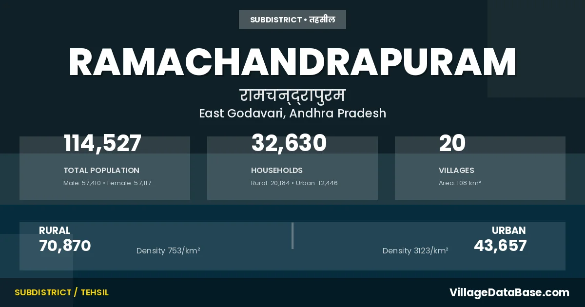 According to the 2011 census The total area of Ramachandrapuram Mandal is 108 km², with a population of 114527 people. The population density is 1,059 inhabitants per square kilometre, and there are approximately 32630 houses in the sub district.