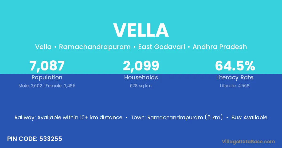 Ramachandrapuram (5 km) is the nearest town to Vella village for major economic activities and is located approximately 5 km away.