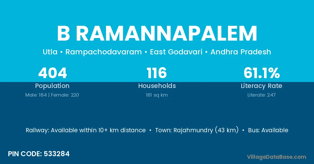 Rajahmundry (43 km) is the nearest town to B Ramannapalem village for major economic activities and is located approximately 43 km away.