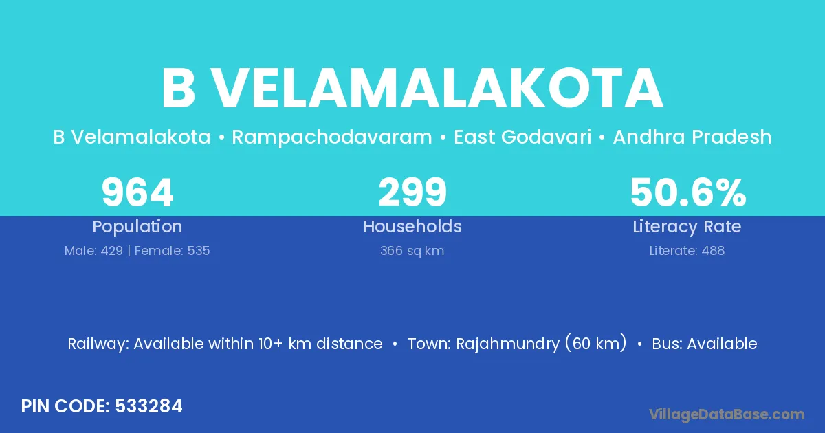 Rajahmundry (60 km) is the nearest town to B Velamalakota village for major economic activities and is located approximately 60 km away.