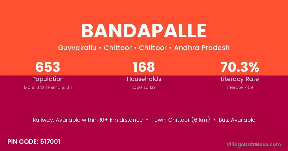 The literacy rate of Bandapalle village is 62.46%. Male literacy stands at 74.83% and female literacy at 41.50%.