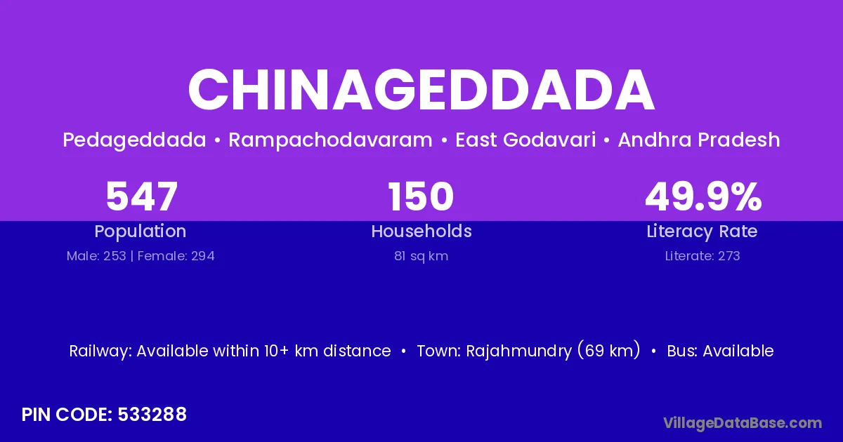 Rajahmundry (69 km) is the nearest town to Chinageddada village for major economic activities and is located approximately 69 km away.