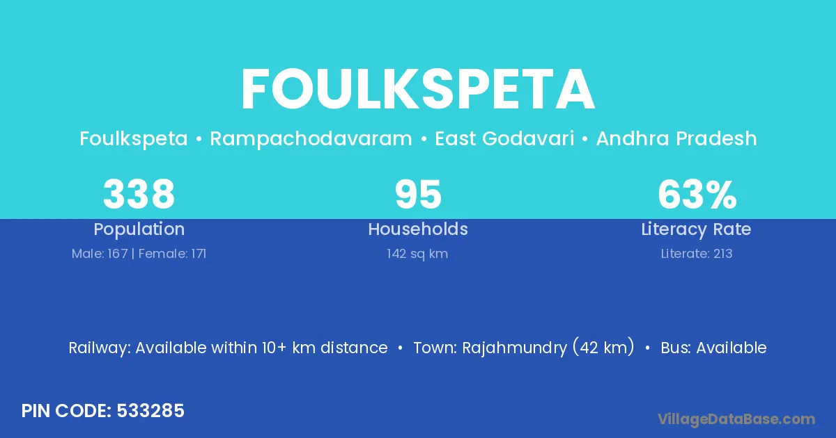 Rajahmundry (42 km) is the nearest town to Foulkspeta village for major economic activities and is located approximately 42 km away.