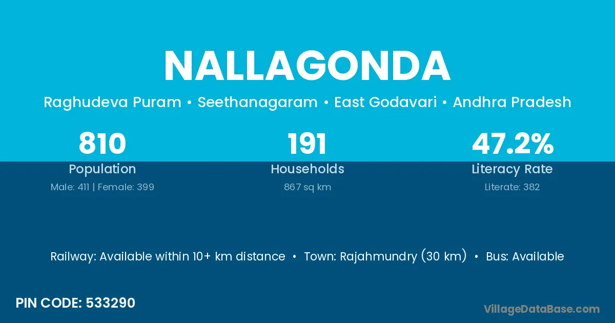 Rajahmundry (63 km) is the nearest town to Nallagonda village for major economic activities and is located approximately 63 km away.
