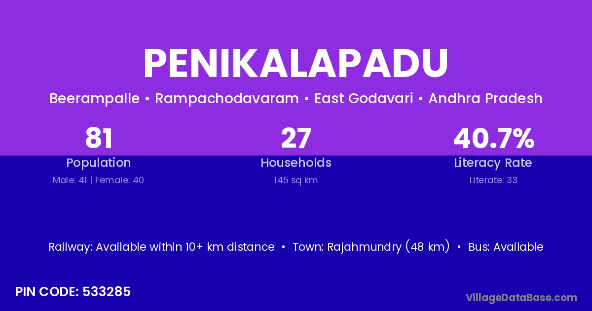 Rajahmundry (48 km) is the nearest town to Penikalapadu village for major economic activities and is located approximately 48 km away.