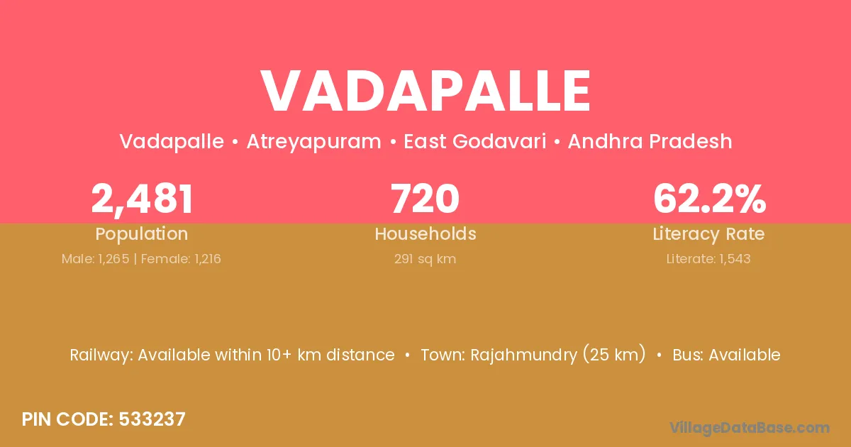 Rajahmundry (66 km) is the nearest town to Vadapalle village for major economic activities and is located approximately 66 km away.