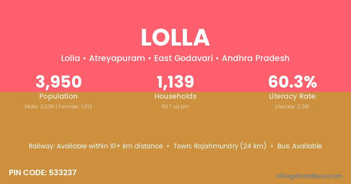 Ramachandrapuram (18 km) is the nearest town to Lolla village for major economic activities and is located approximately 18 km away.