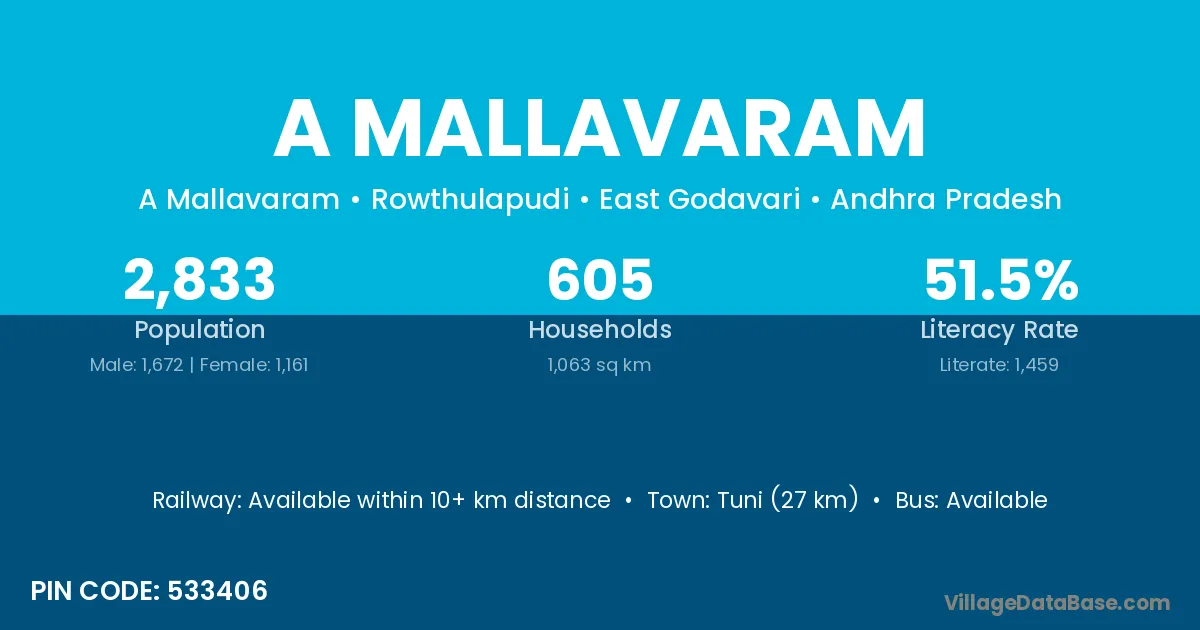 Tuni (27 km) is the nearest town to A Mallavaram village for major economic activities and is located approximately 27 km away.