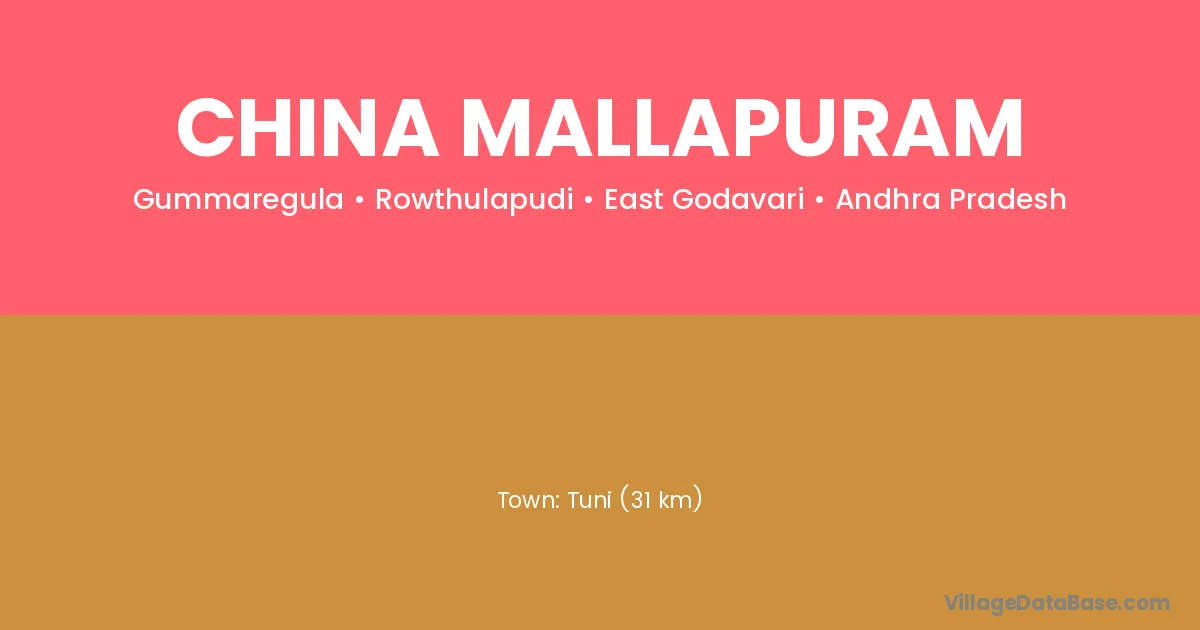 Tuni (31 km) is the nearest town to China Mallapuram village for major economic activities and is located approximately 31 km away.