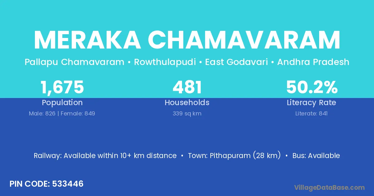 According to Census 2011 information, the village code of Meraka Chamavaram village is 533446.