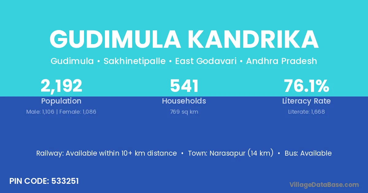 Narasapur (14 km) is the nearest town to Gudimula Kandrika village for major economic activities and is located approximately 14 km away.