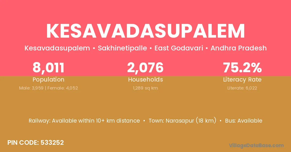 Narasapur (18 km) is the nearest town to Kesavadasupalem village for major economic activities and is located approximately 18 km away.