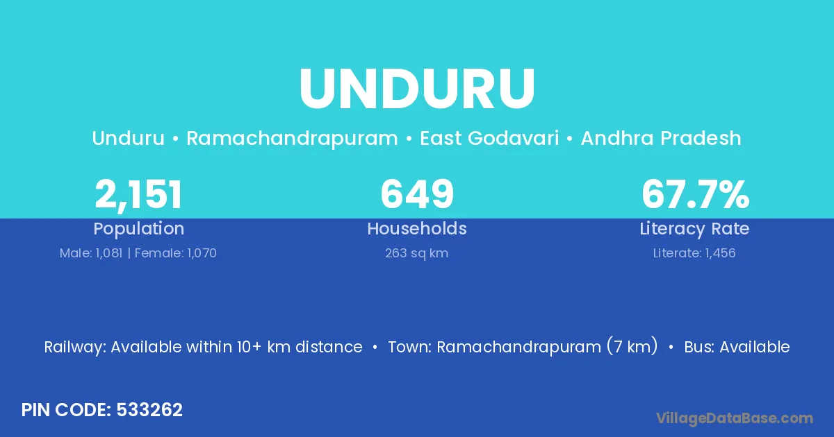 Samalkot (4 km) is the nearest town to Unduru village for major economic activities and is located approximately 4 km away.