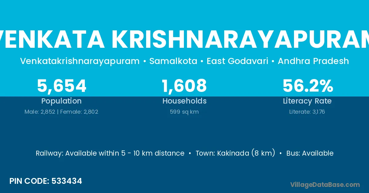 Venkata Krishnarayapuram village has a total population of 5,654 people, of which 2,852 are males and 2,802 are females.