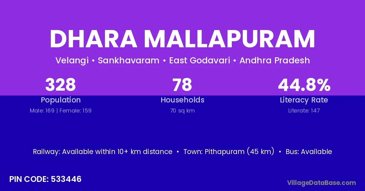Pithapuram (45 km) is the nearest town to Dhara Mallapuram village for major economic activities and is located approximately 45 km away.