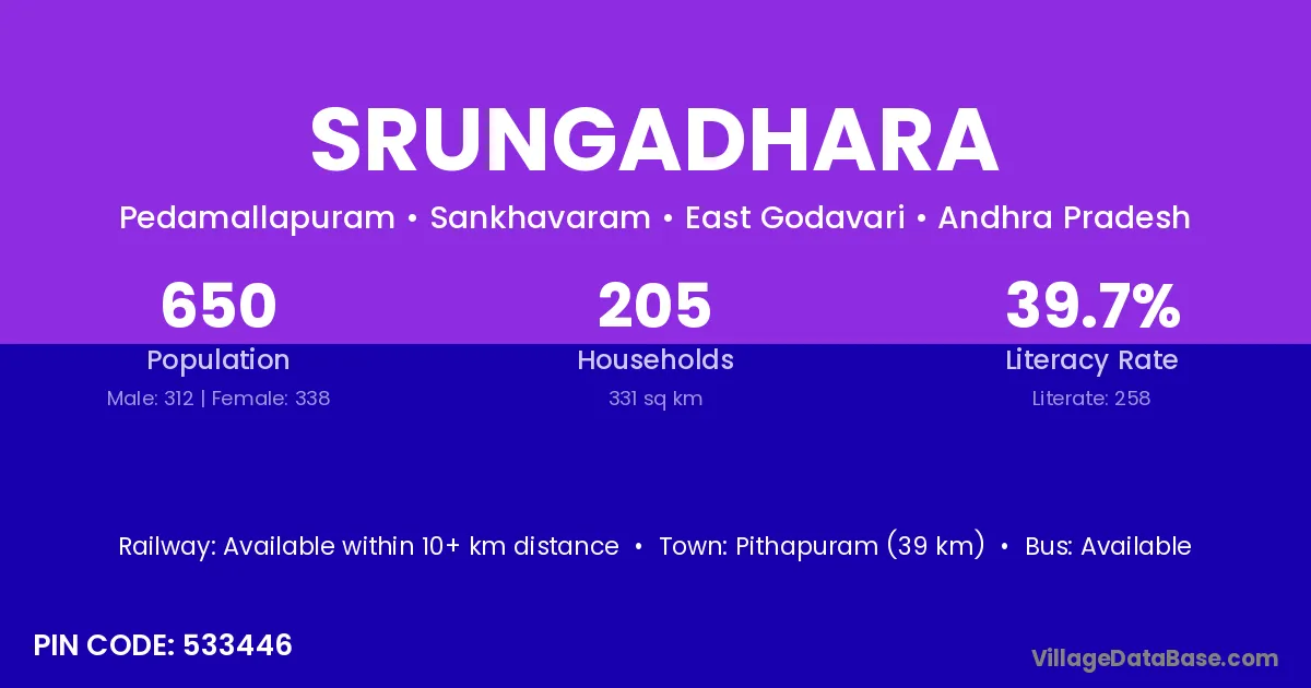 Pithapuram (39 km) is the nearest town to Srungadhara village for major economic activities and is located approximately 39 km away.