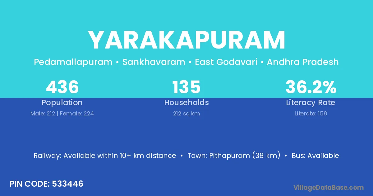 Yarakapuram village has a total population of 436 people, of which 212 are males and 224 are females.