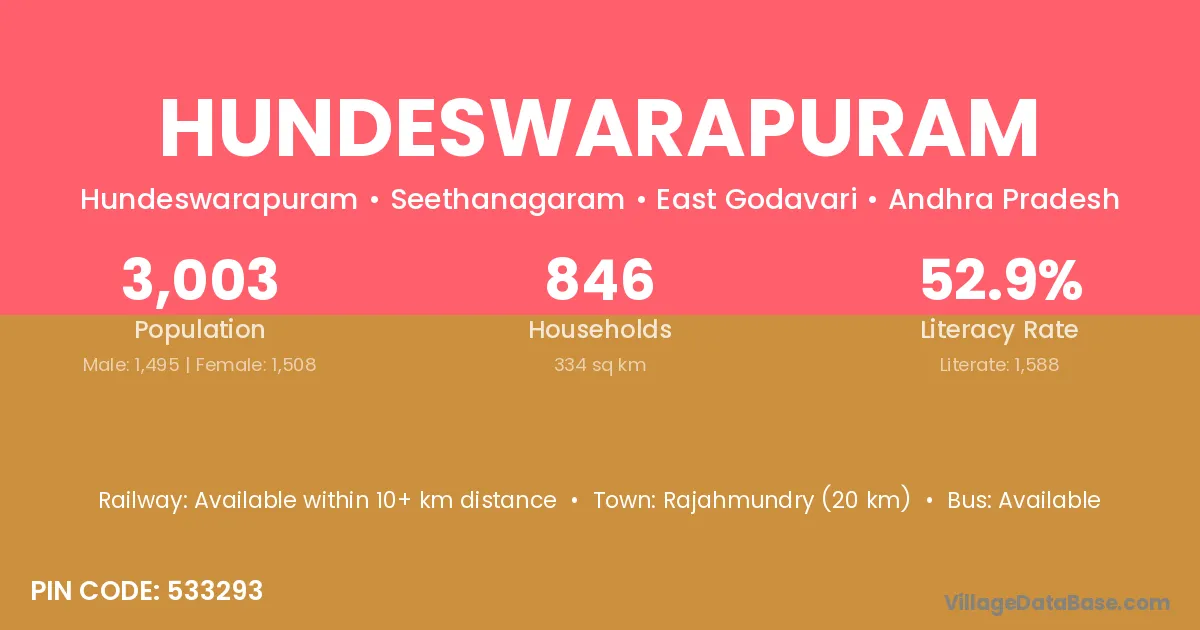 According to Census 2011 information, the village code of Hundeswarapuram village is 533293.