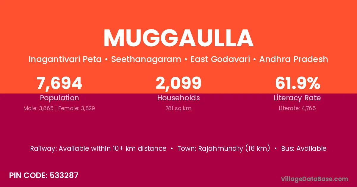 Rajahmundry (16 km) is the nearest town to Muggaulla village for major economic activities and is located approximately 16 km away.