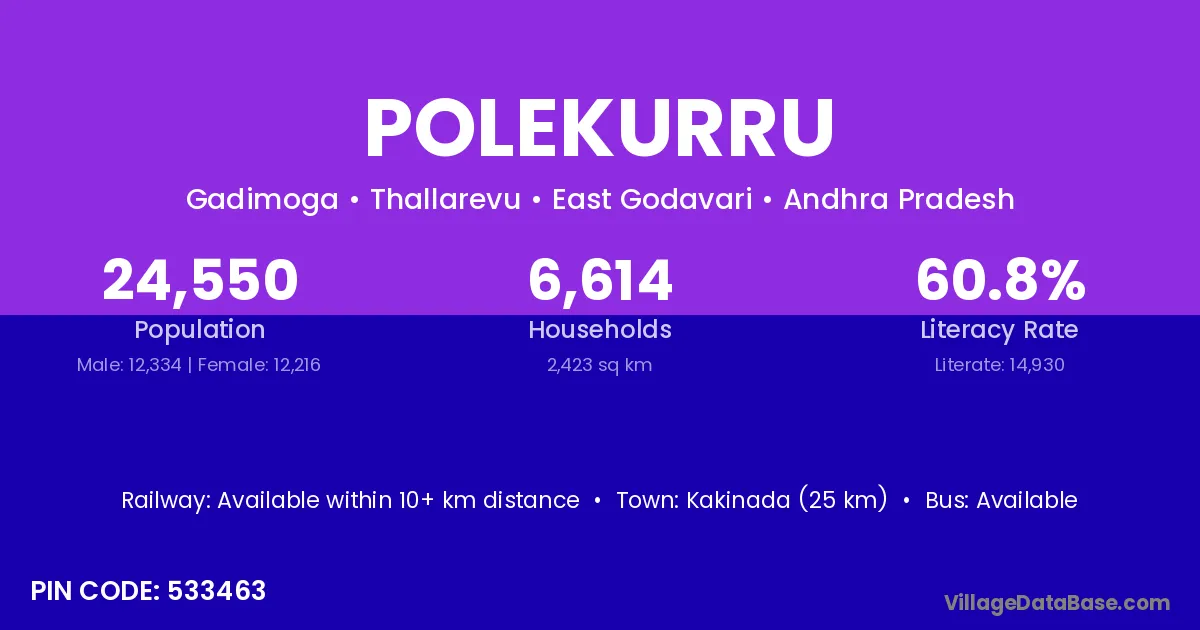 Kakinada (25 km) is the nearest town to Polekurru village for major economic activities and is located approximately 25 km away.