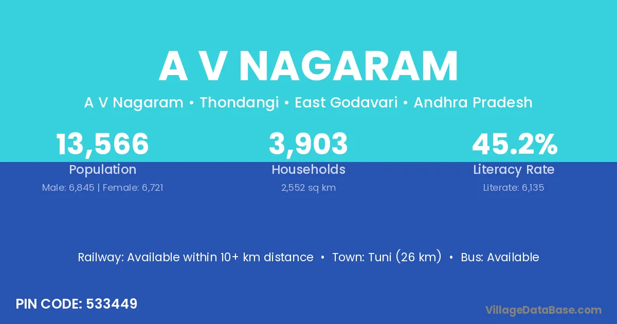 Tuni (26 km) is the nearest town to A V Nagaram village for major economic activities and is located approximately 26 km away.