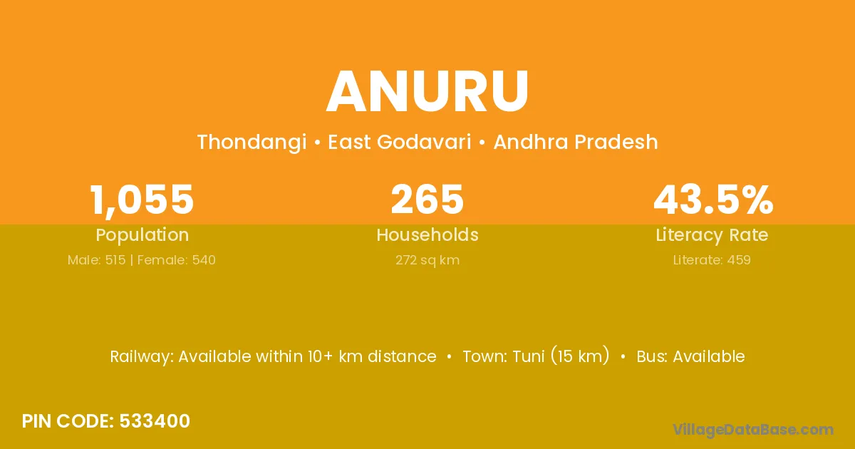 Tuni (15 km) is the nearest town to Anuru village for major economic activities and is located approximately 15 km away.